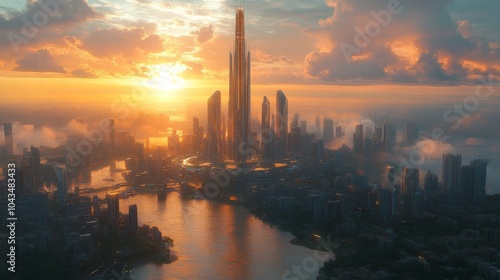 Naklejka premium The skyline showcases a towering skyscraper illuminated by sunset hues, surrounded by modern buildings, with a river flowing, reflecting the stunning colors of the sky and clouds.