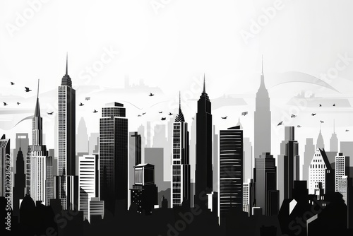 © Tanu, Naklejka premium The skyline showcases various skyscrapers in a silhouette format against a light background, with birds soaring in the air during twilight hours.