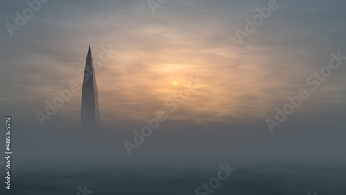 Fototapeta premium The skyscraper sticks out of the thick fog. Low sun in the background