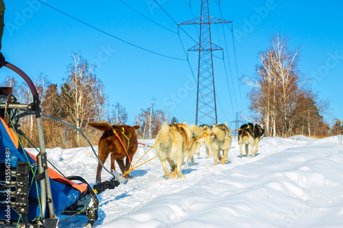 © Baikal360, Naklejka premium The sled dogs malomuty and Husky running on the road ahead