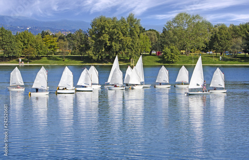 Fototapeta premium The small sailing ships regatta on the blue lake