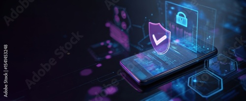 © Miro, Fototapeta premium The smartphone displaying digital security with a shield and lock icon.