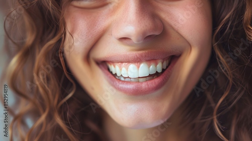 © Wanchai, Fototapeta premium The smile on her face radiates pure happiness, with her eyes crinkling warmly, enhancing the expression of joy. The genuine, open-mouthed grin highlights her white teeth and full lips, creating a sens