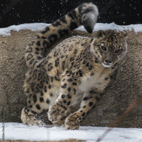 © TATIANA, Naklejka premium The snow leopard is a large predatory mammal of the cat family living in the mountains of Central Asia. He differs thin, long one, flexible the body, short legs, a small head and long one tail.