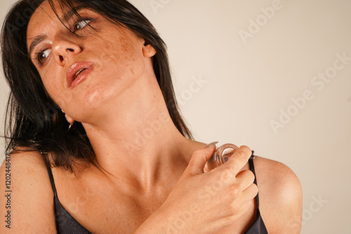 Fototapeta premium The soft layer of highlighter emphasizes her collarbones. Her radiant skin reflects her love for constant and proper care.