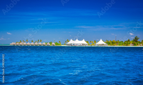 © oleg_mj, Fototapeta premium The solitary island and bungalows in the sea .