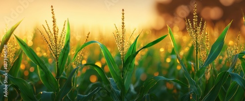 © Studio Nova, Fototapeta premium The sorghum plants in a golden field at sunset with soft bokeh light