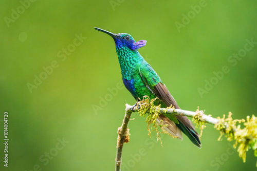 © Miroslav Srb, Fototapeta premium The sparkling violetear (Colibri coruscans), in flight on green background, on tree branch against green background, Mindo, Ecuador