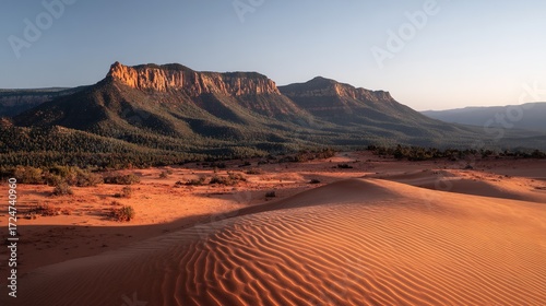 Naklejka premium The spectacular sunset view over the dunes, with mountains in the background, creates a touching and unforgettable moment, becoming a beautiful and peaceful memory.