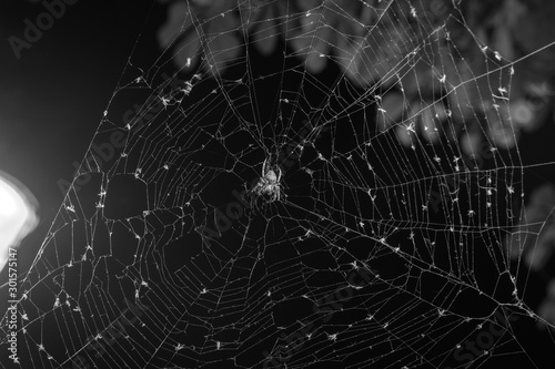 © Sergey, Naklejka premium The spider sits in the web at night. Dark background. Araneus is a genus of common orb-weaving spiders. European garden spider. copy space, black and white