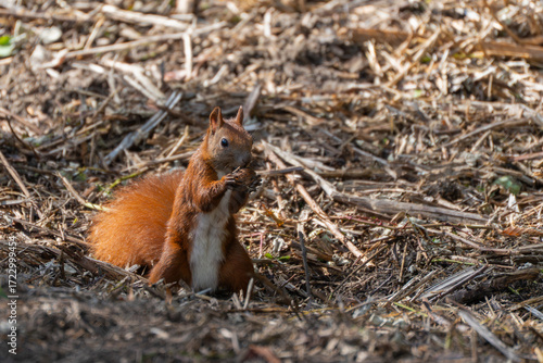 © Jakob, Obraz premium The squirrel eats a nut, holding it firmly with both paws. Its tail is curled behind as it enjoys its meal.