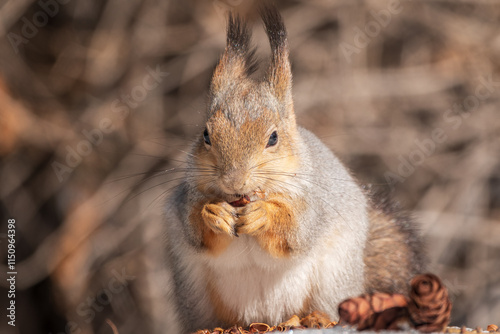 © Dmitrii Potashkin, Fototapeta premium The squirrel in winter sits on white snow.
