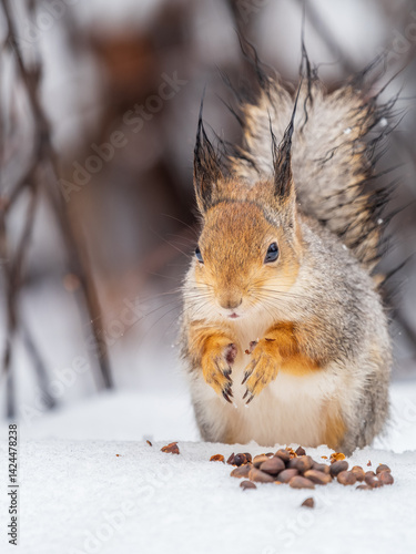 © Dmitrii Potashkin, Fototapeta premium The squirrel in winter sits on white snow.