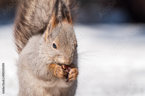 © Dmitrii Potashkin, Fototapeta premium The squirrel in winter sits on white snow.