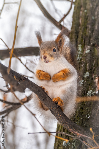 Fototapeta premium The squirrel sits on a branches in the winter or autumn