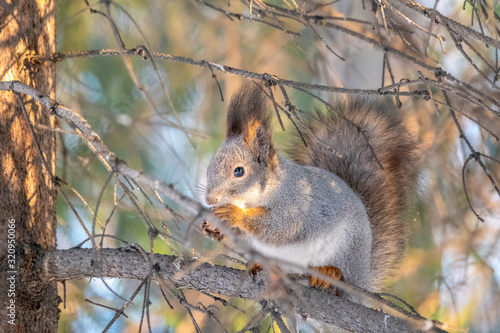 Fototapeta premium The squirrel sits on a branches in the winter or autumn