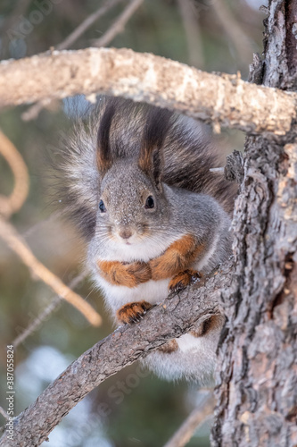 Fototapeta premium The squirrel sits on a fir branches in the winter or autumn