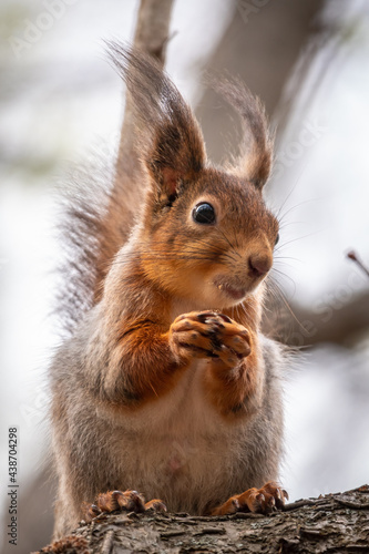 © Dmitrii Potashkin, Fototapeta premium The squirrel with nut sits on a branches in the spring or summer.