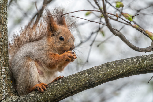 © Dmitrii Potashkin, Fototapeta premium The squirrel with nut sits on a branches in the spring or summer.