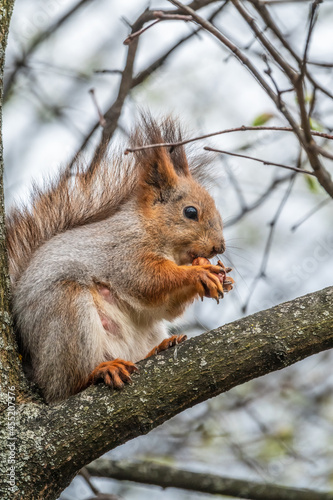 © Dmitrii Potashkin, Fototapeta premium The squirrel with nut sits on a branches in the spring or summer.