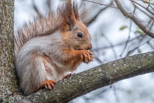 © Dmitrii Potashkin, Fototapeta premium The squirrel with nut sits on a branches in the spring or summer.