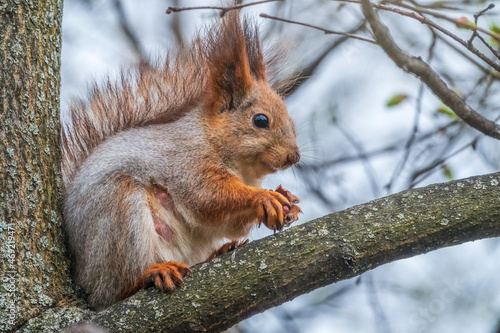 © Dmitrii Potashkin, Fototapeta premium The squirrel with nut sits on a branches in the spring or summer.