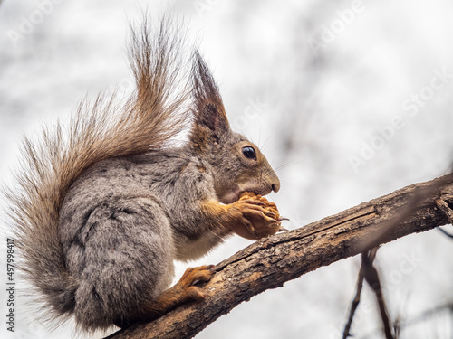© Dmitrii Potashkin, Fototapeta premium The squirrel with nut sits on a branches in the spring or summer.