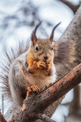 © Dmitrii Potashkin, Fototapeta premium The squirrel with nut sits on a branches in the spring or summer.