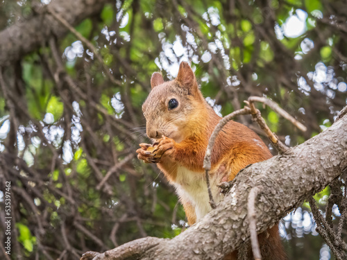 Fototapeta premium The squirrel with nut sits on a branches in the spring or summer.