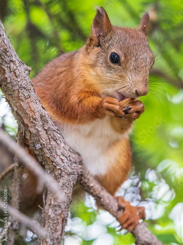 © Dmitrii Potashkin, Fototapeta premium The squirrel with nut sits on a branches in the spring or summer.