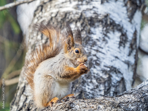 Fototapeta premium The squirrel with nut sits on a branches in the spring or summer.