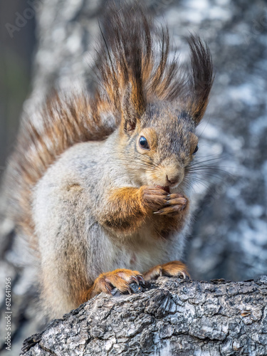 Fototapeta premium The squirrel with nut sits on a branches in the spring or summer.