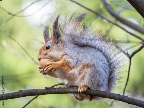 Fototapeta premium The squirrel with nut sits on a branches in the spring or summer.