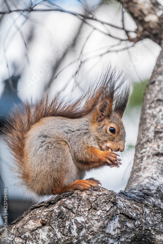 Fototapeta premium The squirrel with nut sits on a branches in the spring or summer.