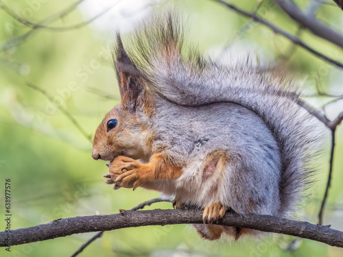© Dmitrii Potashkin, Fototapeta premium The squirrel with nut sits on a branches in the spring or summer.