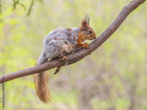 Fototapeta premium The squirrel with nut sits on a branches in the spring or summer.