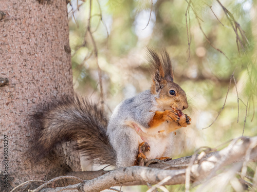 Fototapeta premium The squirrel with nut sits on a branches in the spring or summer.