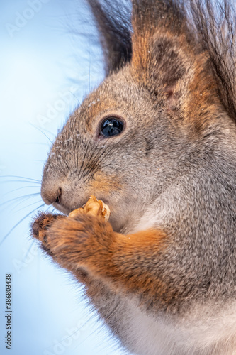 © Dmitrii Potashkin, Obraz premium The squirrel with nut sits on blue sky background in the winter or autumn.
