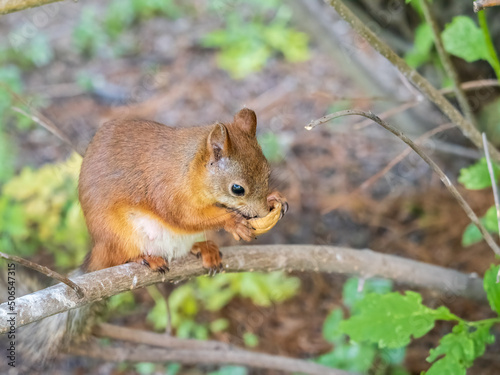 © Dmitrii Potashkin, Fototapeta premium The squirrel with nut sits on tree branches in the summer.