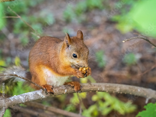 Fototapeta premium The squirrel with nut sits on tree branches in the summer.