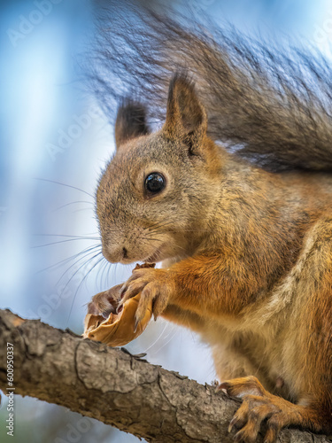 © Dmitrii Potashkin, Obraz premium The squirrel with nut sits on tree in the autumn. Eurasian red squirrel, Sciurus vulgaris.