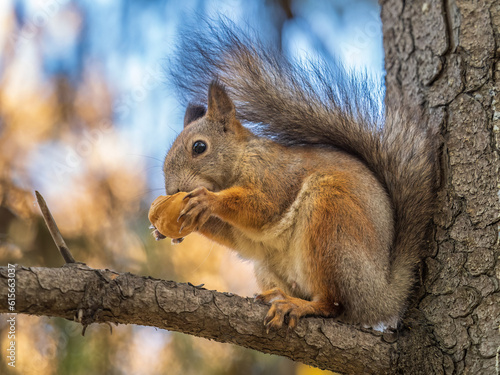 Obraz premium The squirrel with nut sits on tree in the autumn. Eurasian red squirrel,...