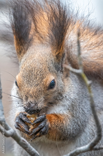 Obraz premium The squirrel with nut sits on tree in the winter or autumn. Eurasian red...