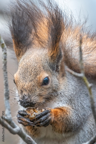 © Dmitrii Potashkin, Obraz premium The squirrel with nut sits on tree in the winter or autumn. Eurasian red squirrel, Sciurus vulgaris.