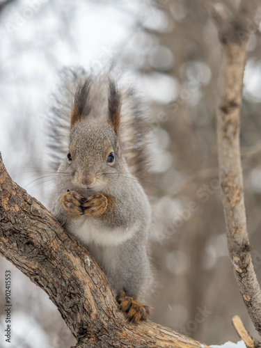 © Dmitrii Potashkin, Obraz premium The squirrel with nut sits on tree in the winter or late autumn