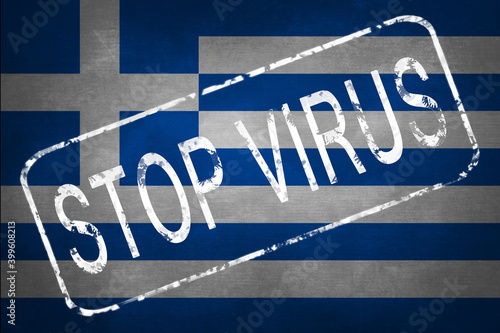 © Alex Puhovoy, Obraz premium The stamp "STOP VIRUS" on the background of the flag of Greece. Quarantine during the COVID-19 coronavirus pandemic in Greece. Anti-epidemic quarantine measures.