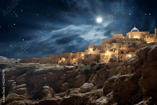Fototapeta premium the Star of Betlehem shines on the birthplace of jesus 2000 years ago near jerusalem, generative ai