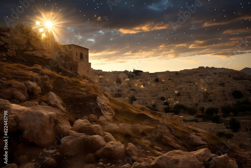 Fototapeta premium the Star of Betlehem shines on the birthplace of jesus 2000 years ago near jerusalem, generative ai