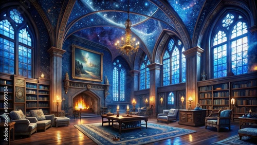 Fototapeta premium The Starlit Library A Fantasy Interior With Cozy Fireplace and Bookshelves, fantasy library , cozy fireplace , bookshelves , interior design