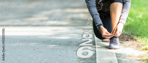 © freebird7977, Naklejka premium The start into the new year 2026. Start up of runner woman running on nature race track go to Goal of Success. People running as part of Number 2025. Holiday sport and health care Concept